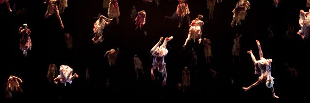 "The sets and costumes designed by the artist are indeed visually impressive, especially a haunting image of children suspended over the stage like ascending angels."